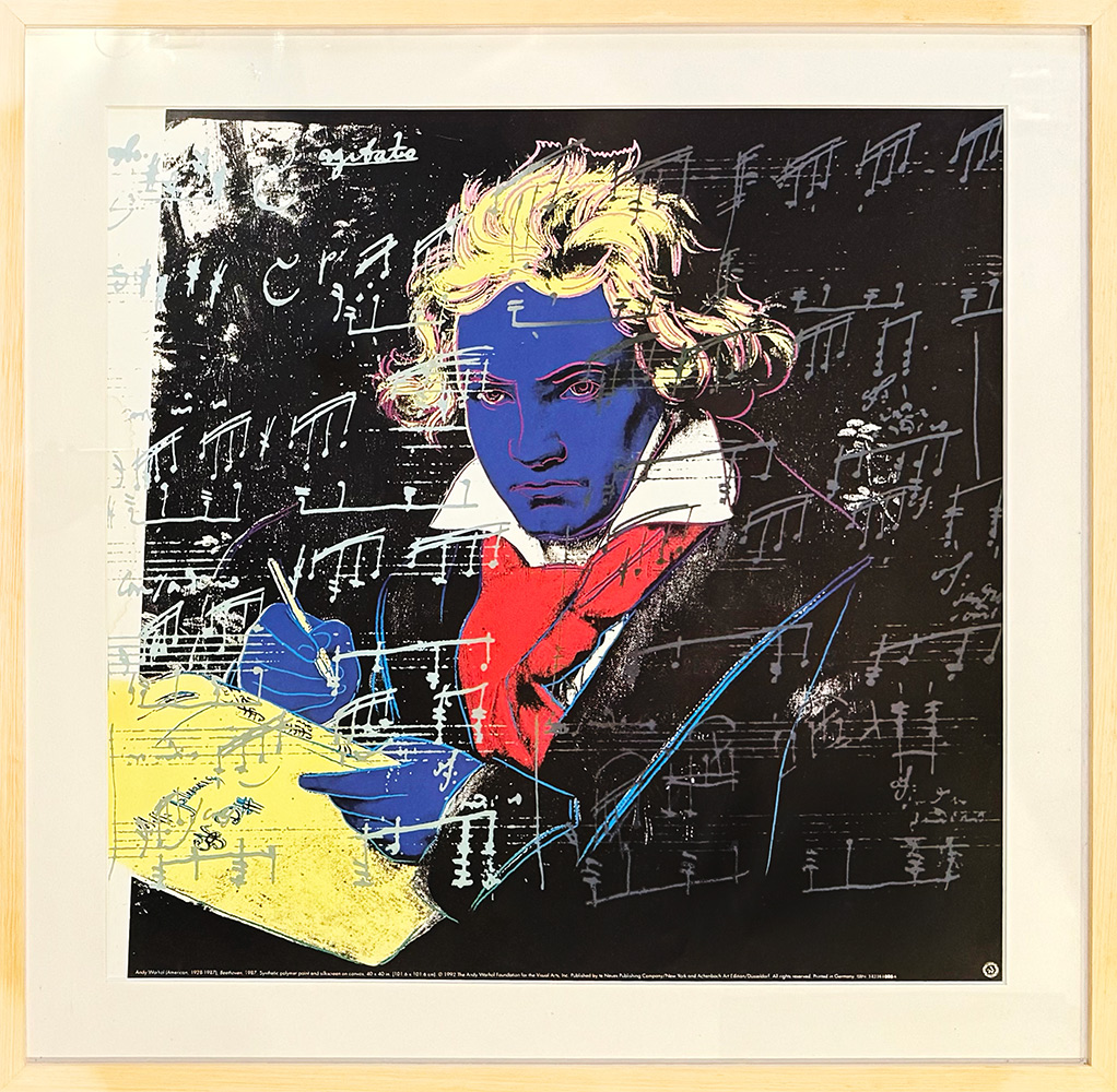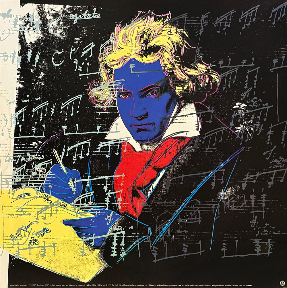 Mooi formaat (60 x 60 cm) hq kunstdruk van een kleurrijk Pop Art portret van Beethoven, naar het origineel van Andy Warhol uit 1982.