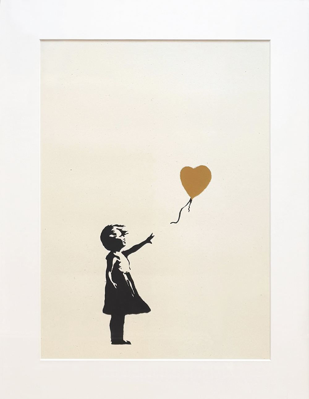 Girl with balloon (gold) is met de hand gedrukt door the West Country Prince. Een exacte replica zeefdruk, met de goedkeuring van Banksy, zo lijkt het.