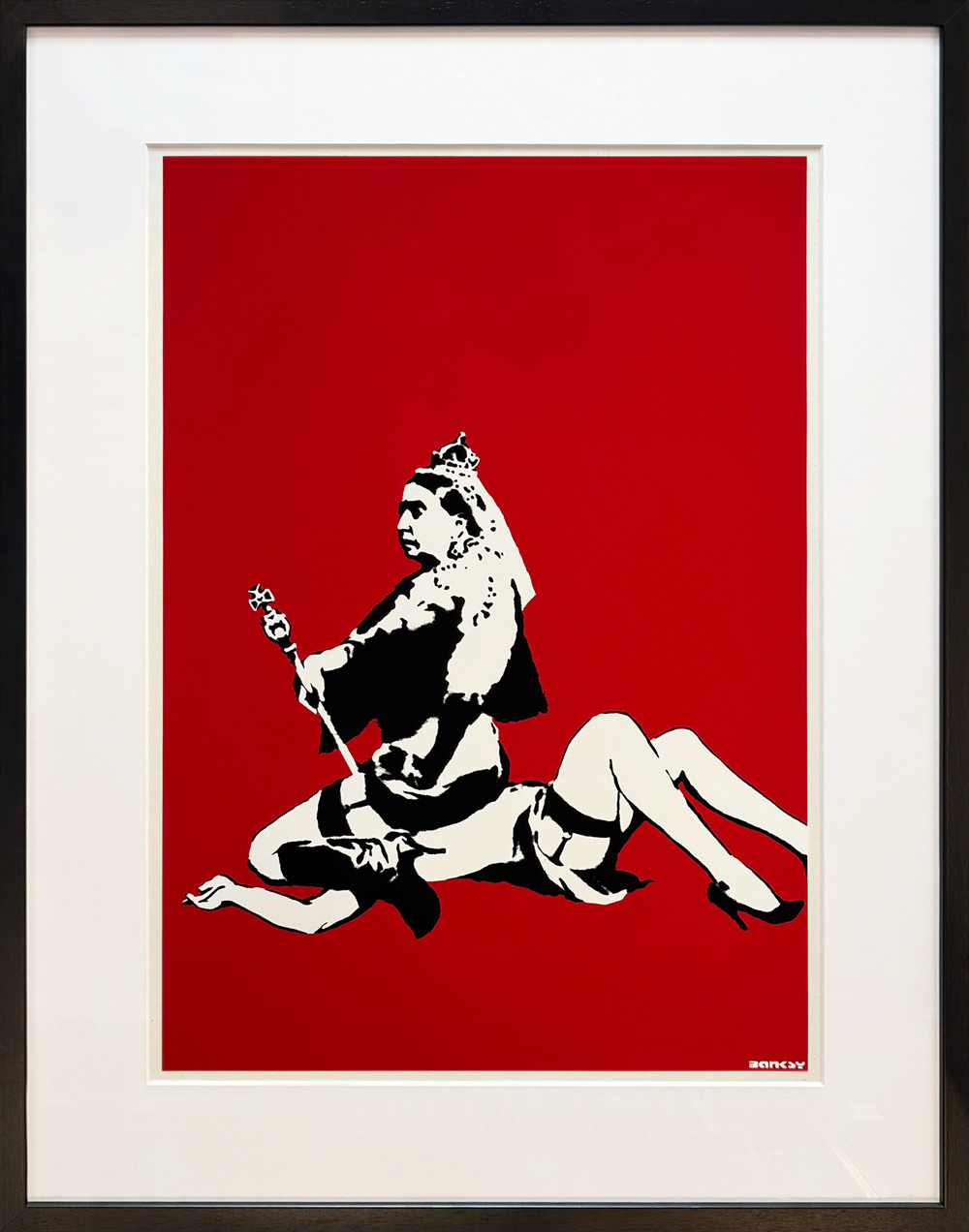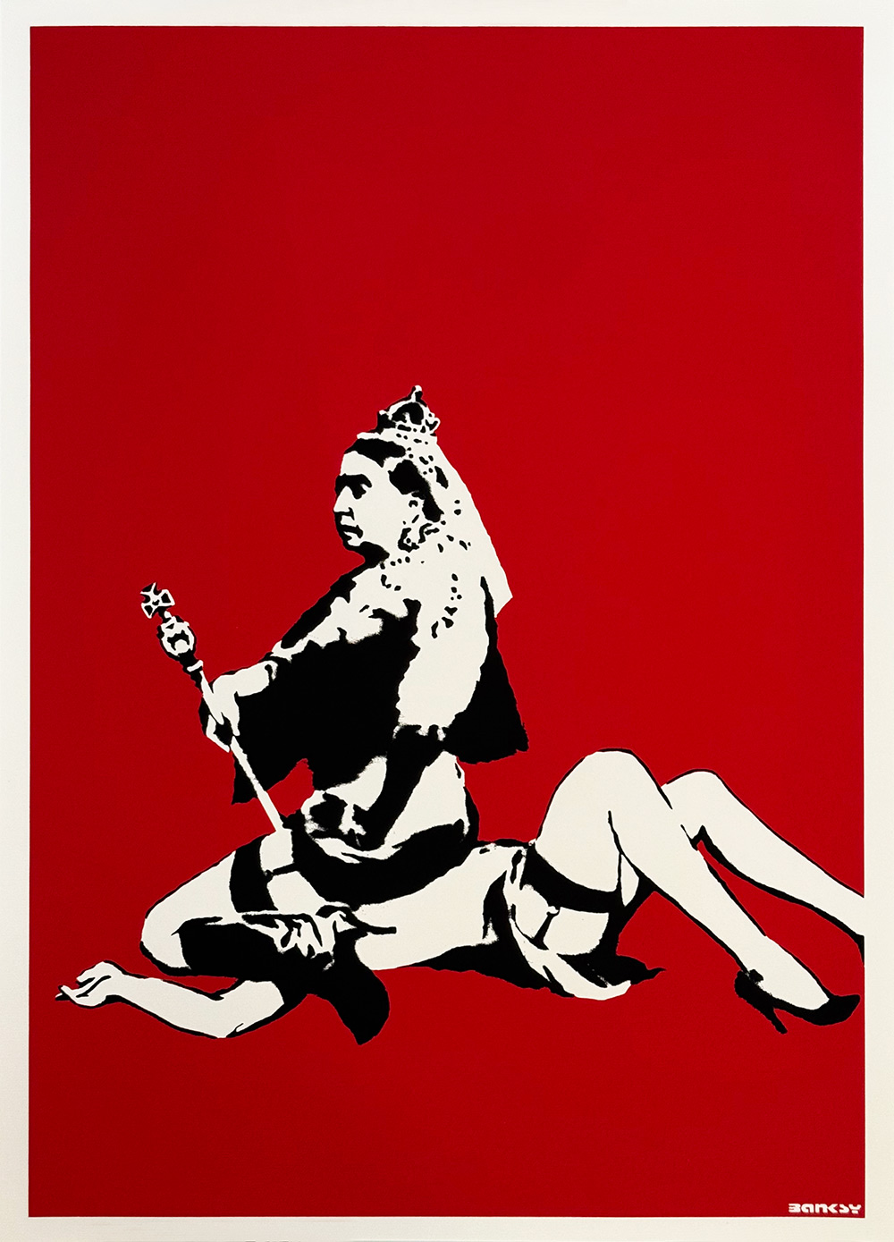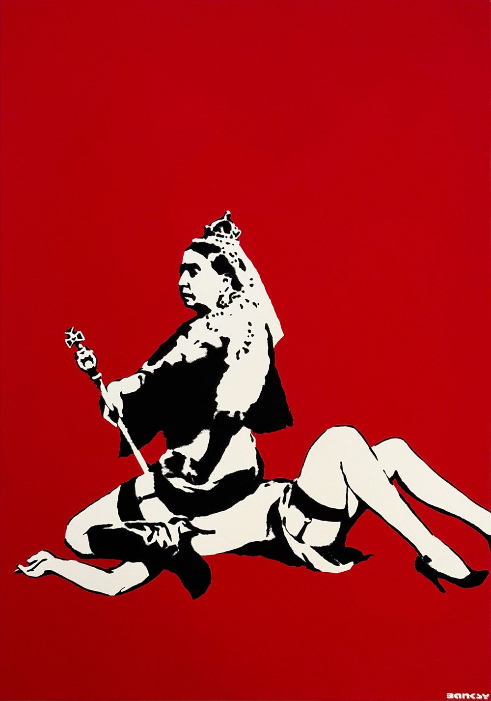 De zeefdruk Queen Victoria (2003) van Banksy, door de West Country Prince, toont de Britse vorstin in een controversiële pose. Met dit iconische beeld bekritiseert Banksy de victoriaanse moraal, hypocrisie en onderdrukking, en maakt hij een krachtig statement over macht, autoriteit en seksualiteit.