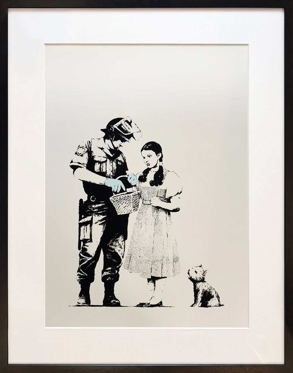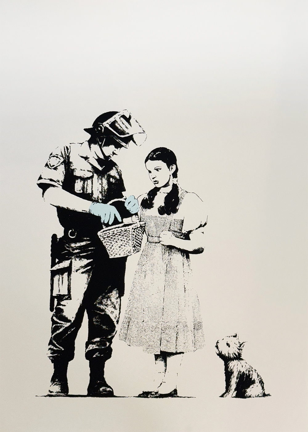 Deze Banksy zeefdruk door WCP toont in zwart-wit Dorothy uit The Wizard of Oz met haar hond Toto, terwijl een politieagent haar mand doorzoekt. Alleen de blauwe latex handschoenen van de agent geven kleur en benadrukken de spanning in de scène.