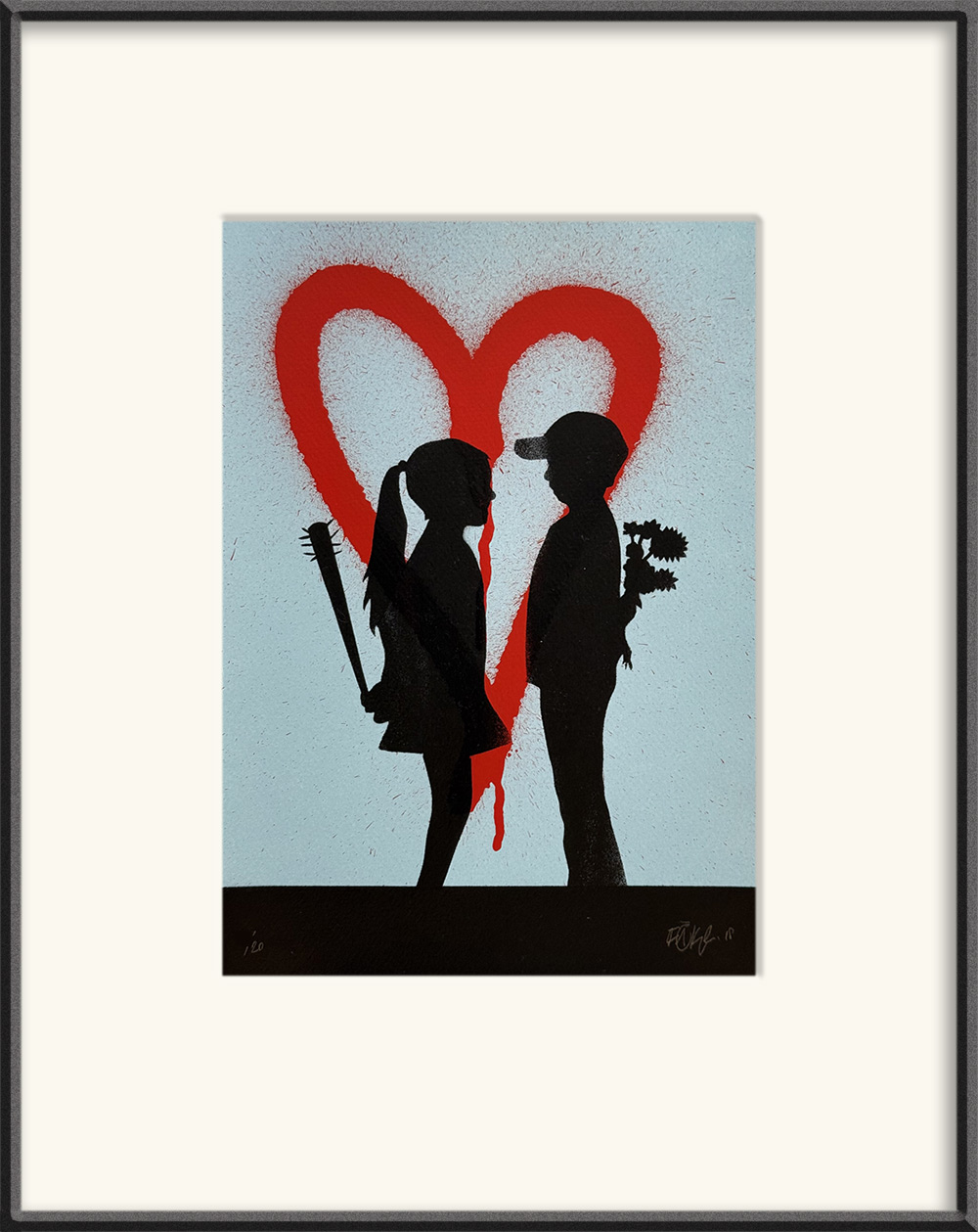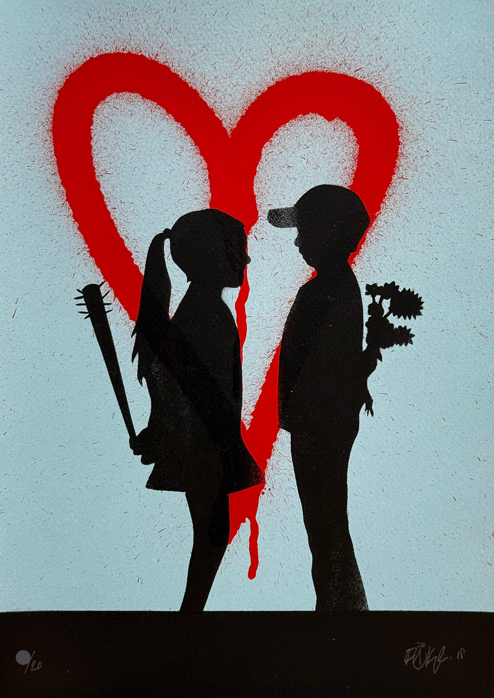 Origineel sprayart van FAKE met de titel Fake Love. Liefde kan soms ook pijn doen. Het kunstwerk is in kleine oplage met spuitbus op papier gespoten, elk werk is daarmee anders en uniek.