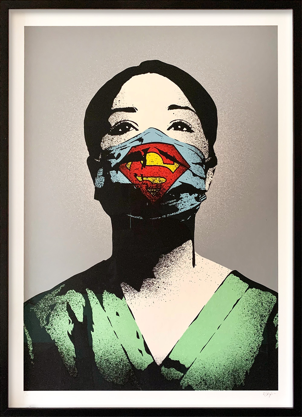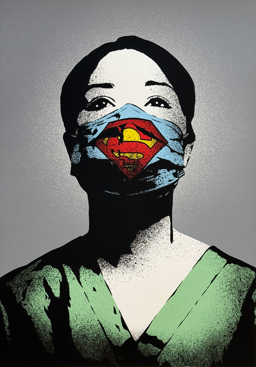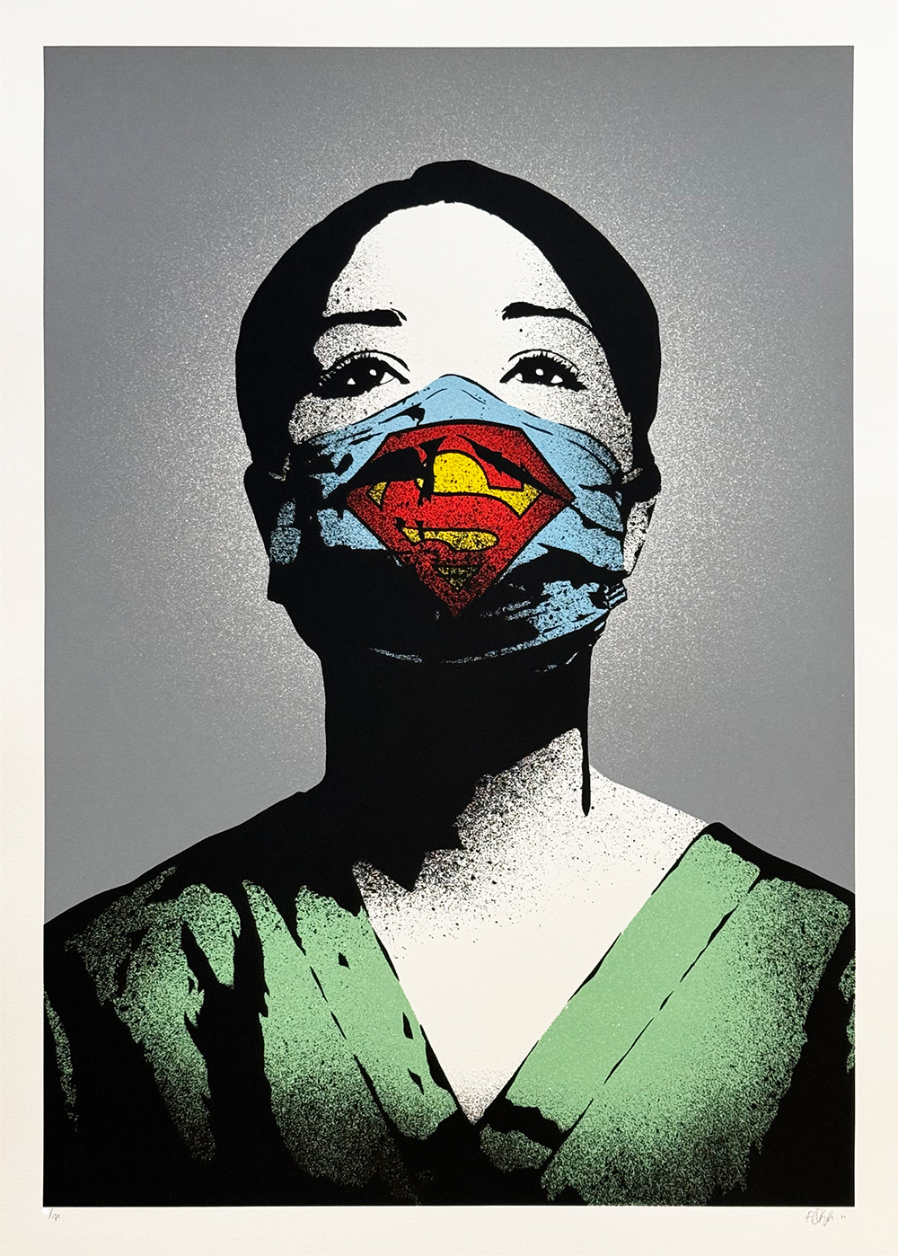 Street artist FAKE maakte, naar aanleiding van zijn muurschildering Super Nurse, deze indrukwekkende zeefdruk. Het kunstwerk (uit de Corona periode) is een eerbetoon aan zorgmedewerkers en groeide uit tot een wereldwijd bekend street art-icoon.