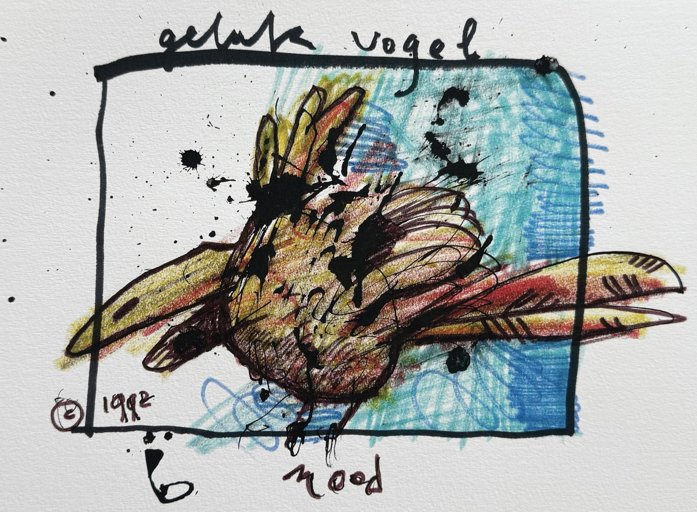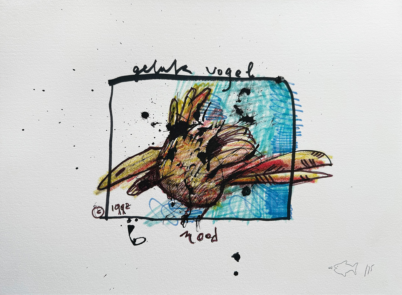 Mooi kleurrijk uitgewerkt kunstwerkje van Herman Brood met de mooie titel Geluksvogel. Grafiek in een zeer kleine oplage van slechts 75 stuks, in 1992 gerealiseerd voor de Staatsloterij.