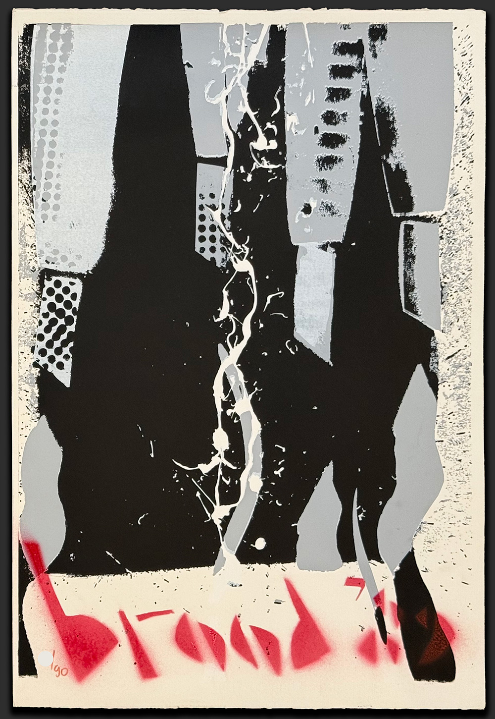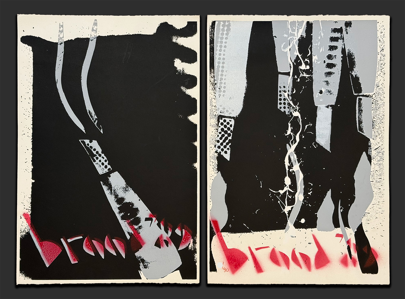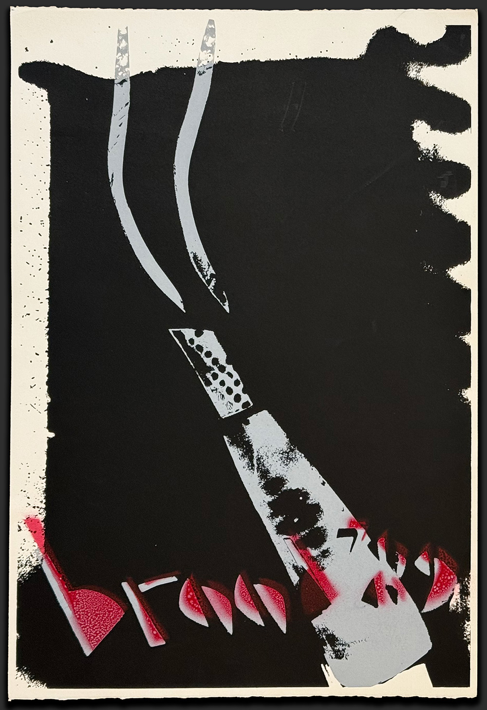 VERKOCHT – De zeefdruk Guns (1989) van Herman Brood is een krachtig tweeluik in zwart- en grijstinten. De rauwe energie en rebelse stijl van Brood komen naar voren, versterkt door zijn met spuitbus aangebrachte ‘name tag’, die elk werk uniek maakt.