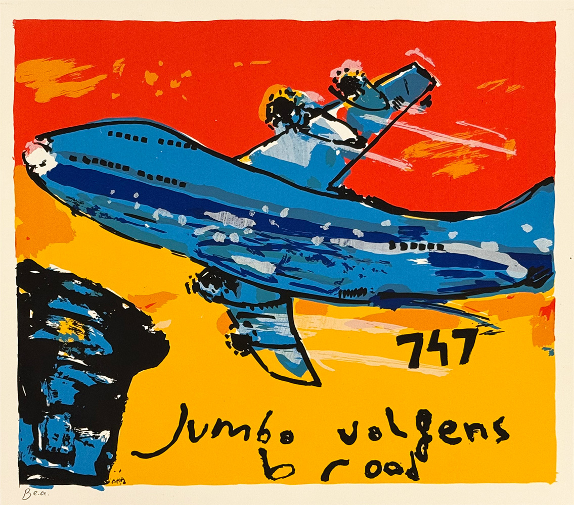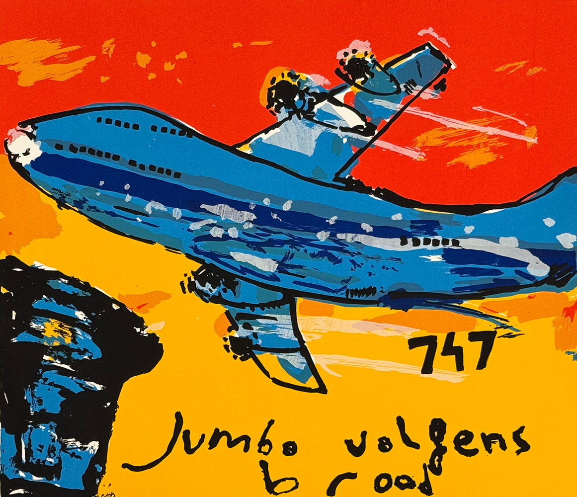Schitterende Jumbo 747 zeefdruk uit de ‘Broodbox’ van Herman Brood. Een kleurrijk kunstwerk in primaire kleuren op een formaat van ± 35 x 40 cm.