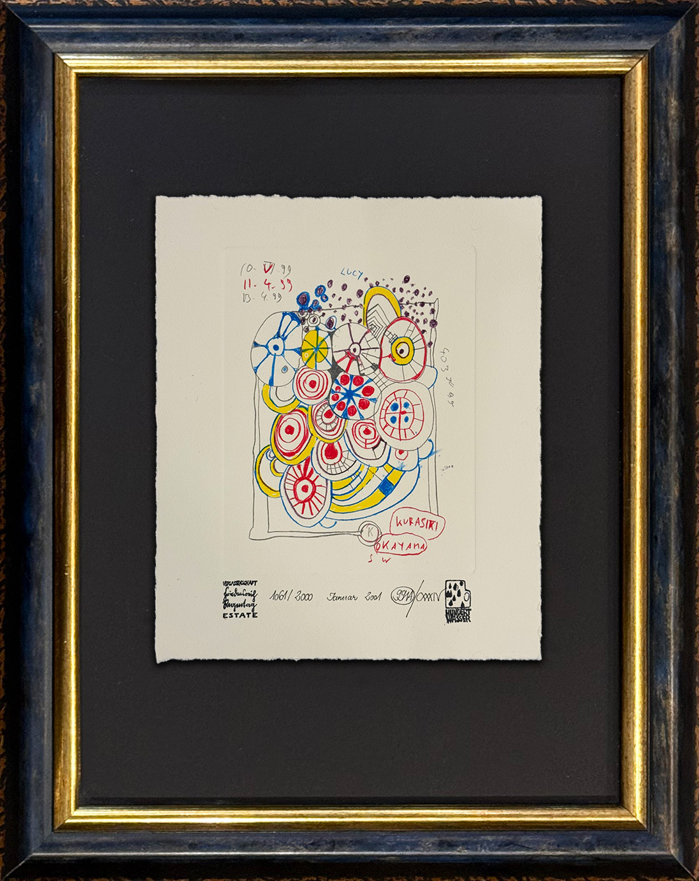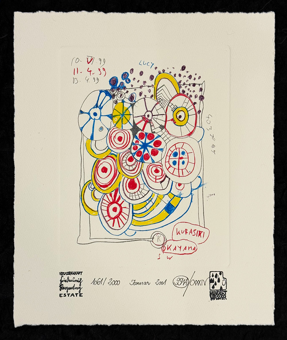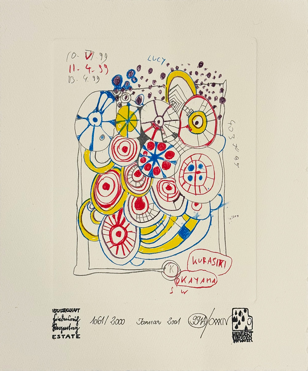 Ets en aquatint van Friedensreich Hundertwasser uit 2001 met de titel Doodle Drawings. De kunstenaar creëerde deze liefdevol uitgewerkte “krabbels”, die hij zelf treffend Doodles noemde.