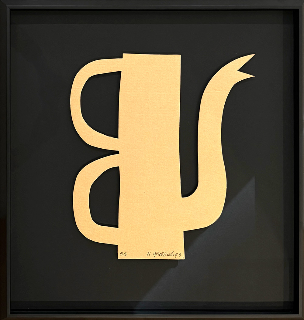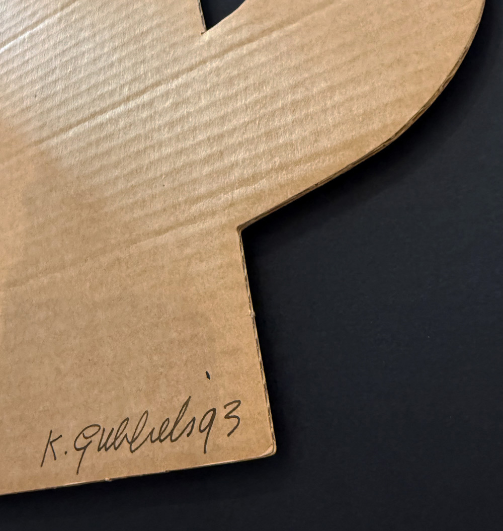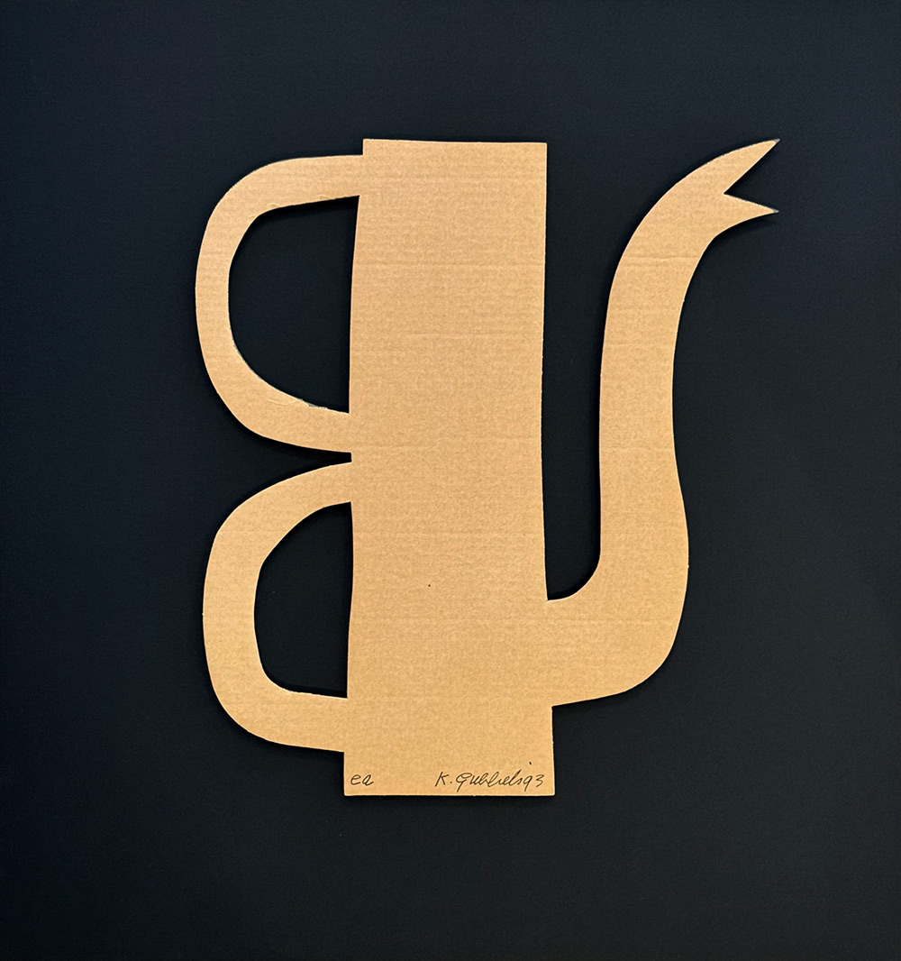 Handgesneden koffiekan met dubbel oor door kunstenaar Klaas Gubbels. Het kartonnen kunstwerk is handgesigneerd en gedateerd 1993.
