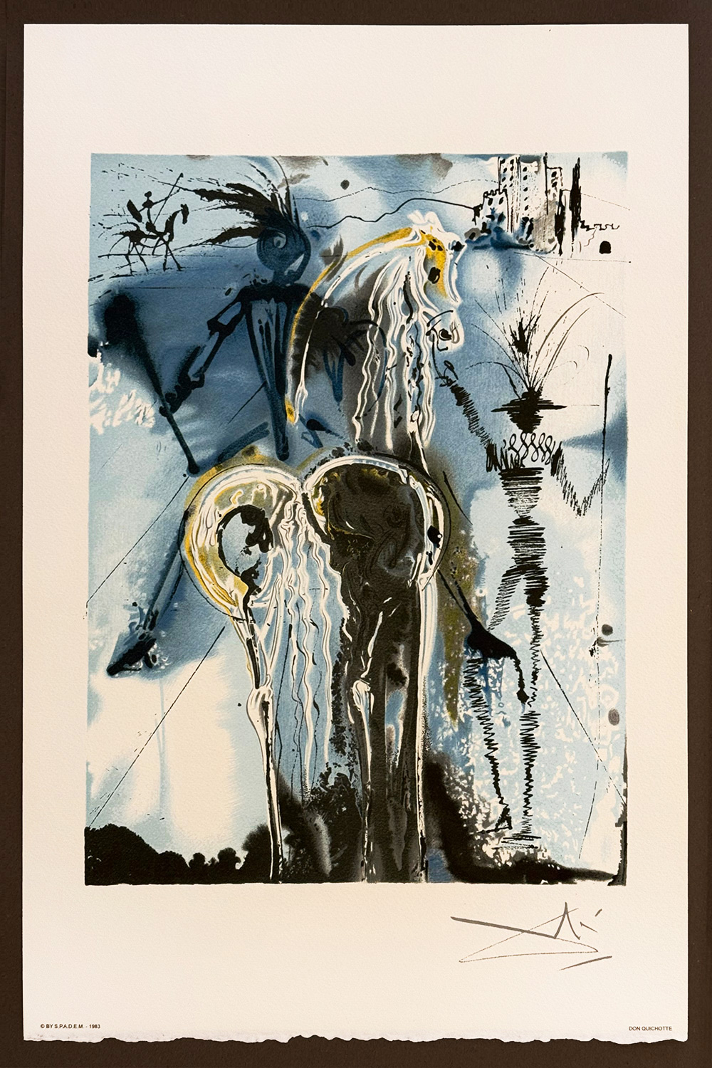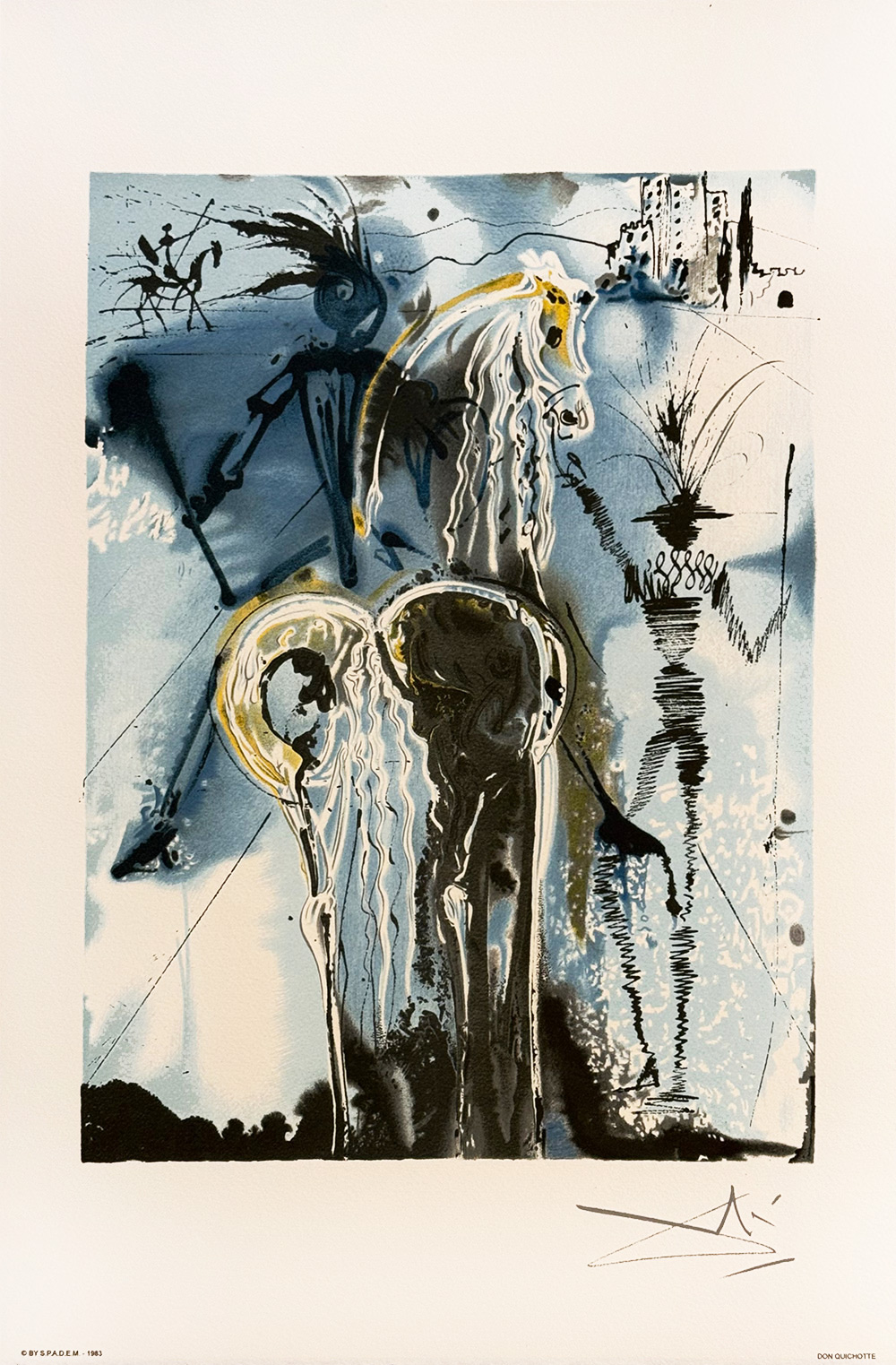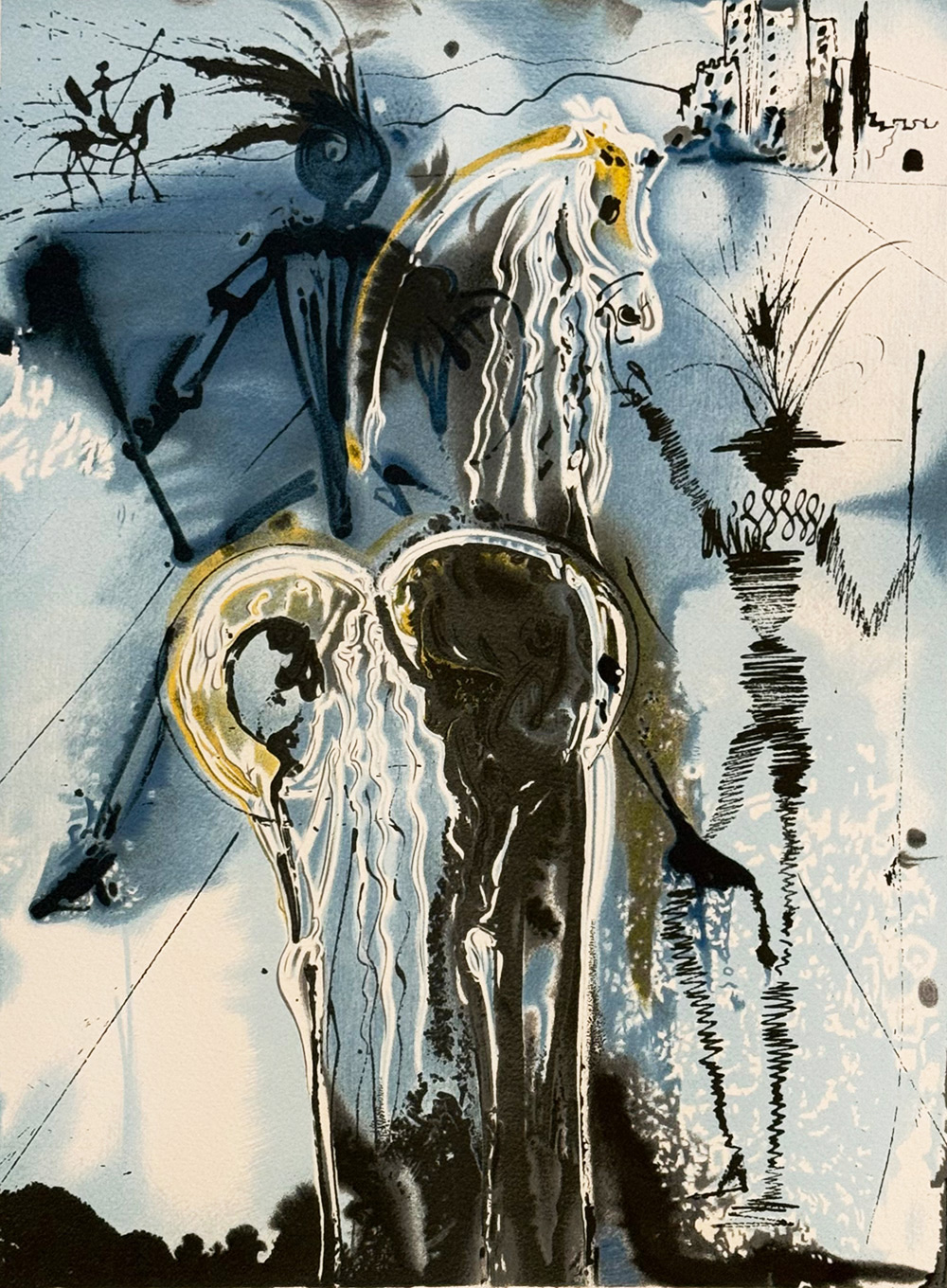 Fraaie lithografie van Don Quichot met zijn paard, een thema dat Salvador Dalí vaak gebruikte. Het paard symboliseert kracht, elegantie en schoonheid. Dit kunstwerk is een eerbetoon aan het dier en zijn betekenis in kunst en mythologie.